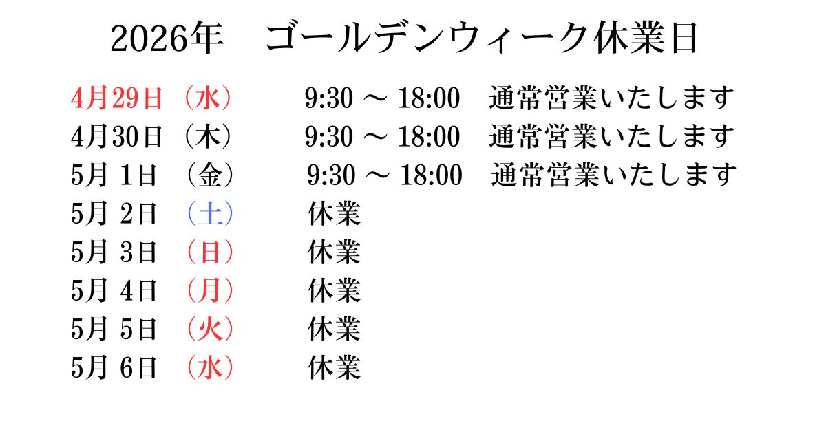 2026年(令和8年)のゴールデンウィーク期間の営業は、以下の通りとなります。